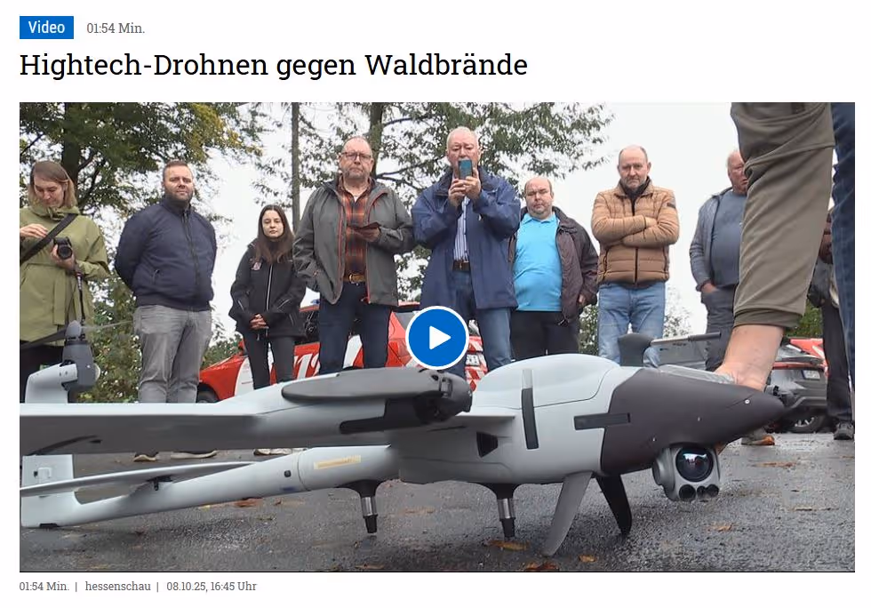 Zahlreiche Feuerwehrleute, Fachleute und Vertreter aus Politik und Verwaltung waren am Mittwoch an der Alheimerhütte im hessischen Rotenburg a. d. Fulda zusammengekommen, um die Testflüge von Drohnen im Rahmen des Projekts KIWA („KI-basierte Waldüberwachung“) zu verfolgen.